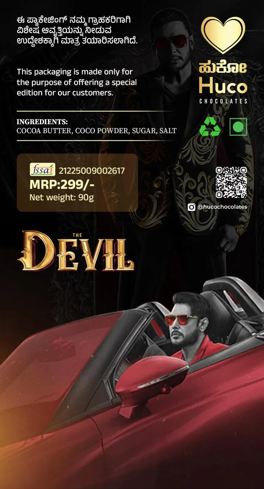 Huco — Namma Karnataka da proud Kannada chocolate brand 🇰🇳 — brings a bar inspired completely by the cinematic intensity of Devil Movie, crafted for fans who love swag, style & power.